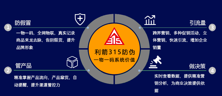 利箭防伪溯源系统的建立对产品供应链管理全程可视化,使用一物一码帮助企业快速构建良好的供应链生态体系,包括工厂、经销商、门店三种角色的不同管理方式,实现各业务环节的o2o闭环。咨询电话:400-015-2315